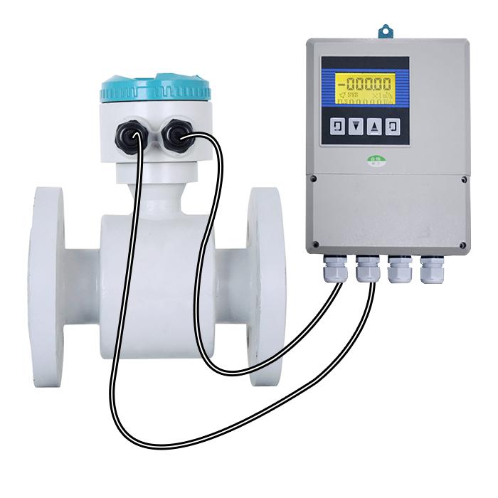 电磁流量计是一种高性能、高可靠性的流量计。电磁流量计的结构主要由磁路系统、测量导管、电极、外壳、衬里和转换器等部分组成。 法兰式电磁流量计就显示方式分为:分体型电磁流量计,一体型电磁流量计。电磁流量计系列公称通径DN15~DN3000。一体式电磁流量计测量原理是基于法拉第电磁感应定律,由传感器和转换器组成,传感器安装在测量管道上,转换器可以与传感器组合连接在一起称为一体型电磁流量计,转换器被安装在离传感器30米内或100米内的场合,两者间由屏蔽电缆连接称为分离型电磁流量计。传感器主要组成部分是:测量管、电极、励磁线圈、铁芯与磁轭壳体。