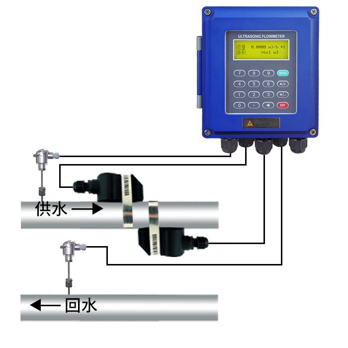 由热源供应的热水(冷水)以较高(低)的温度流入热交换系统(散热器、换热器或由它们组成的复杂系统),以较低(高)的温度流出,在此过程中,通过热量交换向用户释放或吸收热量(注:该过程包括采暖系统和制冷系统能量交换过程)。当水流经热交换系统时,根据换能器给出的流量和配对温度传感器给出的供回水温度,以及水流经时间,通过计算器计算并显示该系统所释放或吸收的热量。